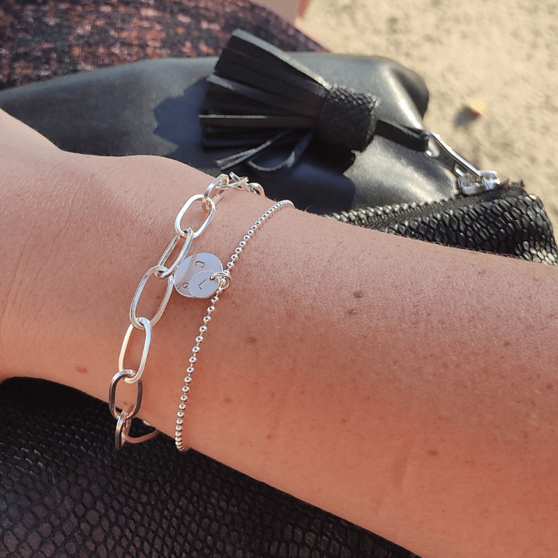 Minimalistische zilveren armband met zilveren gepersonaliseerde tag(s). In zijn eenvoud alleen te dragen of in combinatie met eventueel de armband connect zoals op één van de foto’s te zien.