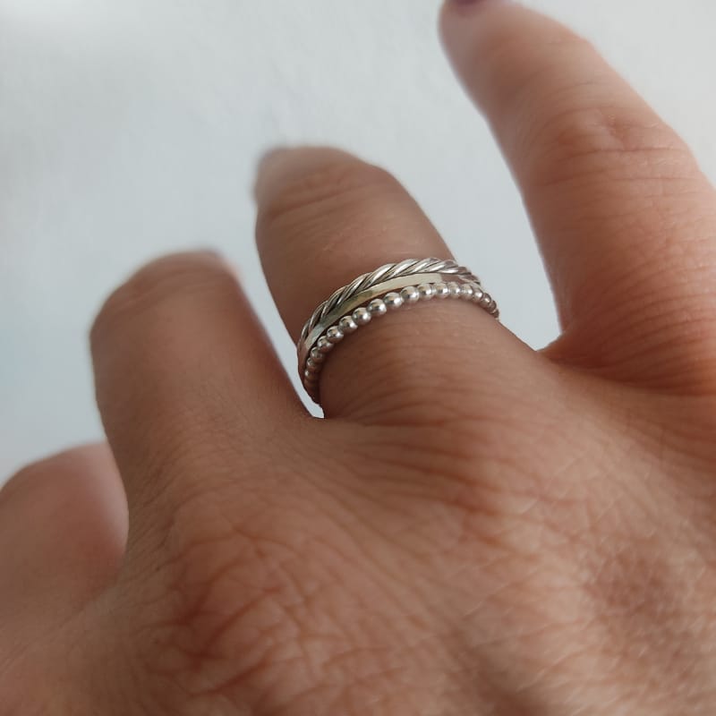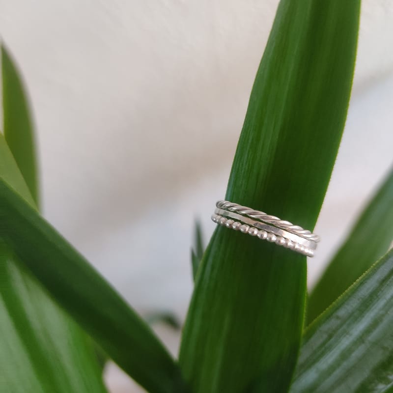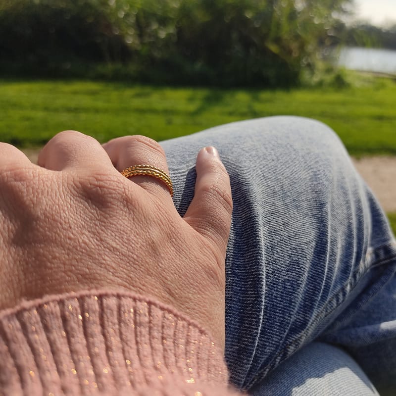 Minimalistische ringen die afwisselend kunnen gecombineerd worden met verschillende andere ontwerpen uit de OYÉ collectie. Deze ringset bevat de ringen: New Beads | Hammer time (thin) | Let’s twist again. Deze ringset kan ook verguld worden in 14 karaat goud (geel of rosé goud).